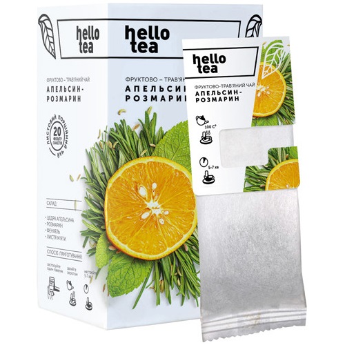 Фруктовий чай Hello Tea Апельсин розмарин – унікальна суміш трав, спецій, фруктів і цукатів. У складі всього 4 інгредієнти: листя м’яти, розмарин, апельсинова цедра та фенхель. В результаті виходить багатогранна палітра смаків та ароматів.