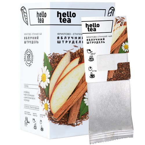 Фруктовий чай Hello Tea Яблучний Штрудель — це суміш ройбушу, квітів ромашки, шматочків яблук та кориці. Справжнє втілення осінніх затишних вечорів. І назва повною мірою описує аромат та смак цього фруктового чаю!