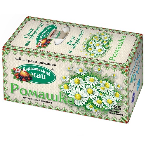 Карпатський Ромашка має трав’яно-квітковий, трохи гіркуватий смак. Природний аромат. Має корисні для організму властивості. Цей еко продукт виготовлений в Івано-Франківську із високоякісної сировини, зібраної на схилах гір екологічно чистих районів Карпат.
